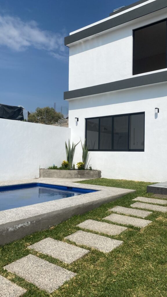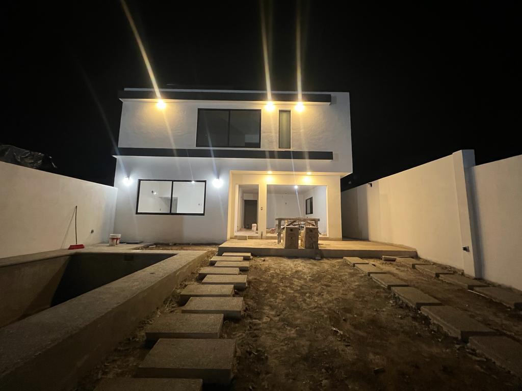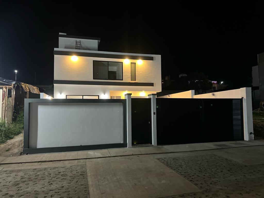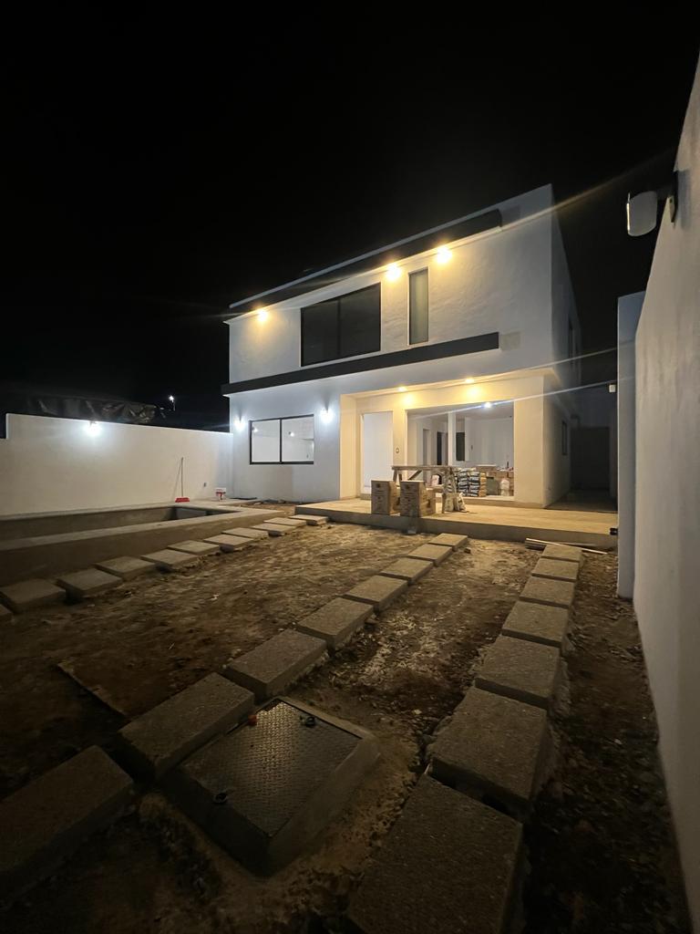 Casa nueva de dos niveles con 4 recámaras (una en planta baja), 3 baños, sala, comedor, cocina equipada, jardín , alberca, garaje para 2 autos y vigilancia