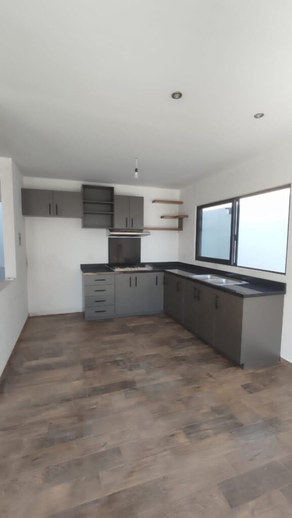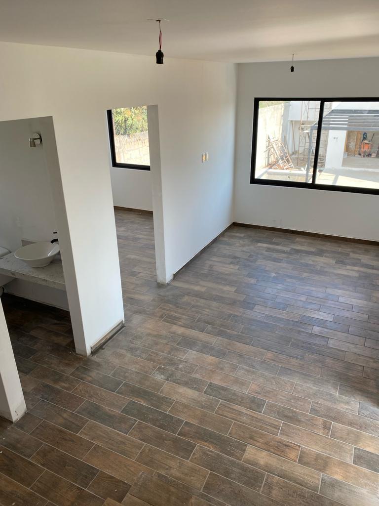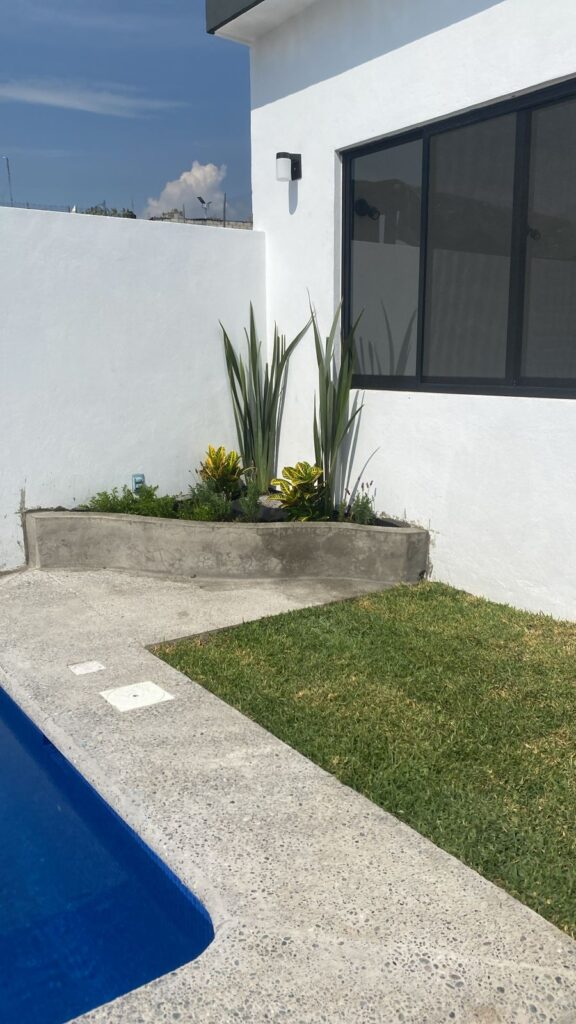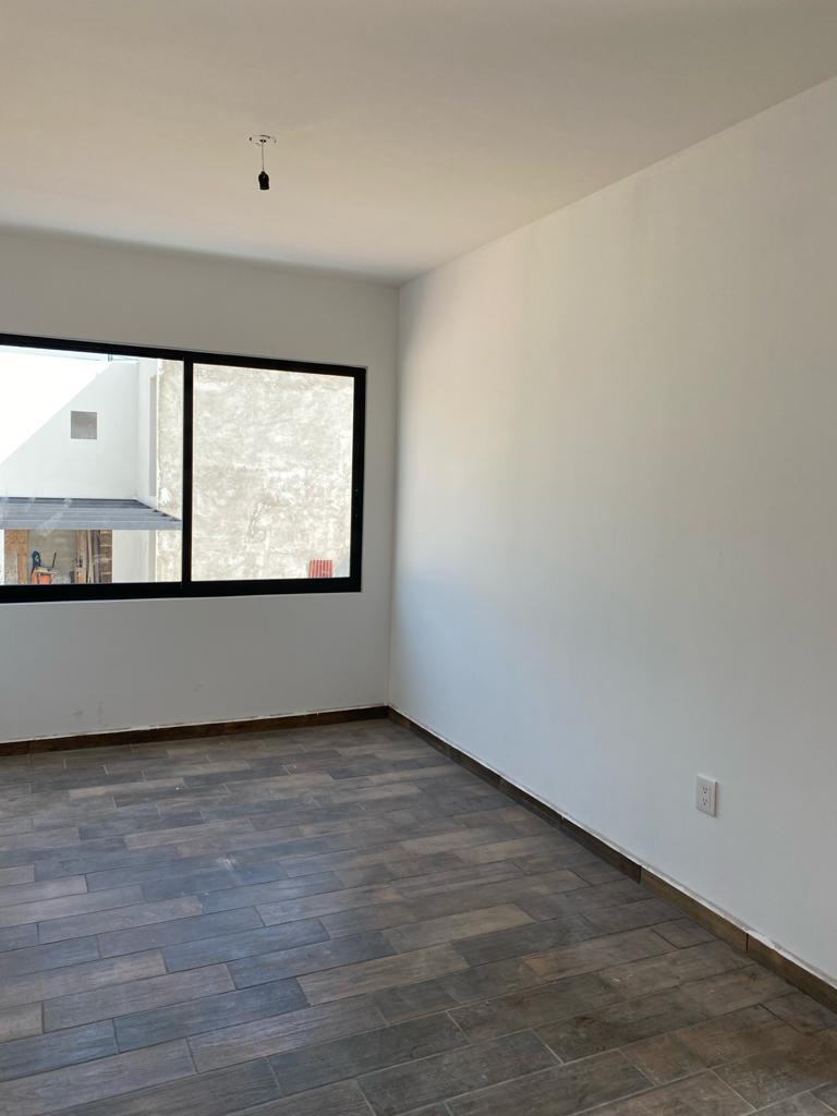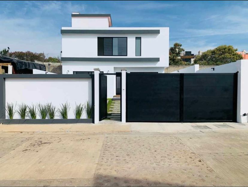 Casa nueva de dos niveles con 4 recámaras (una en planta baja), 3 baños, sala, comedor, cocina equipada, jardín , alberca, garaje para 2 autos y vigilancia